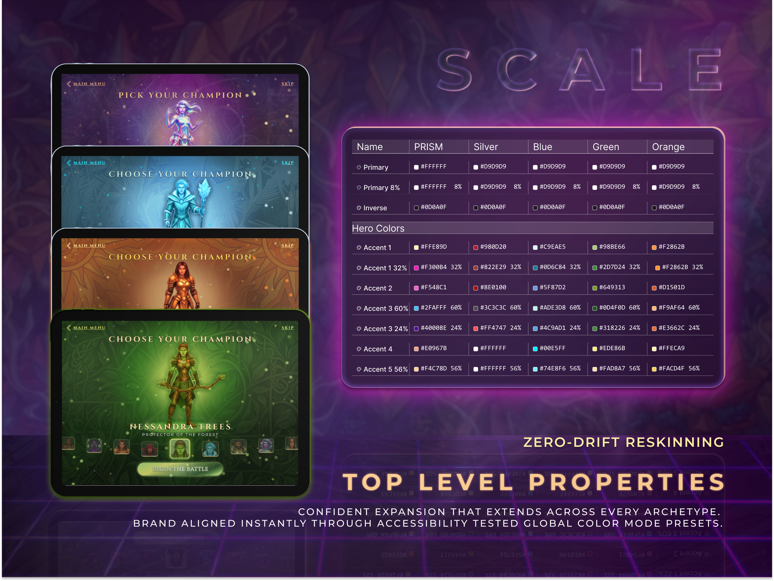 Every glow, outline, and lighting effect is governed by a global token structure. Accent colors 1 through 5, each with opacity variants, carry the entire visual language across all archetypes. Reskinning happens at the token level and propagates instantly with no drift between components. The modular structure keeps every element individually editable, and extending the token set further unlocks cross-archetype color mixing.
