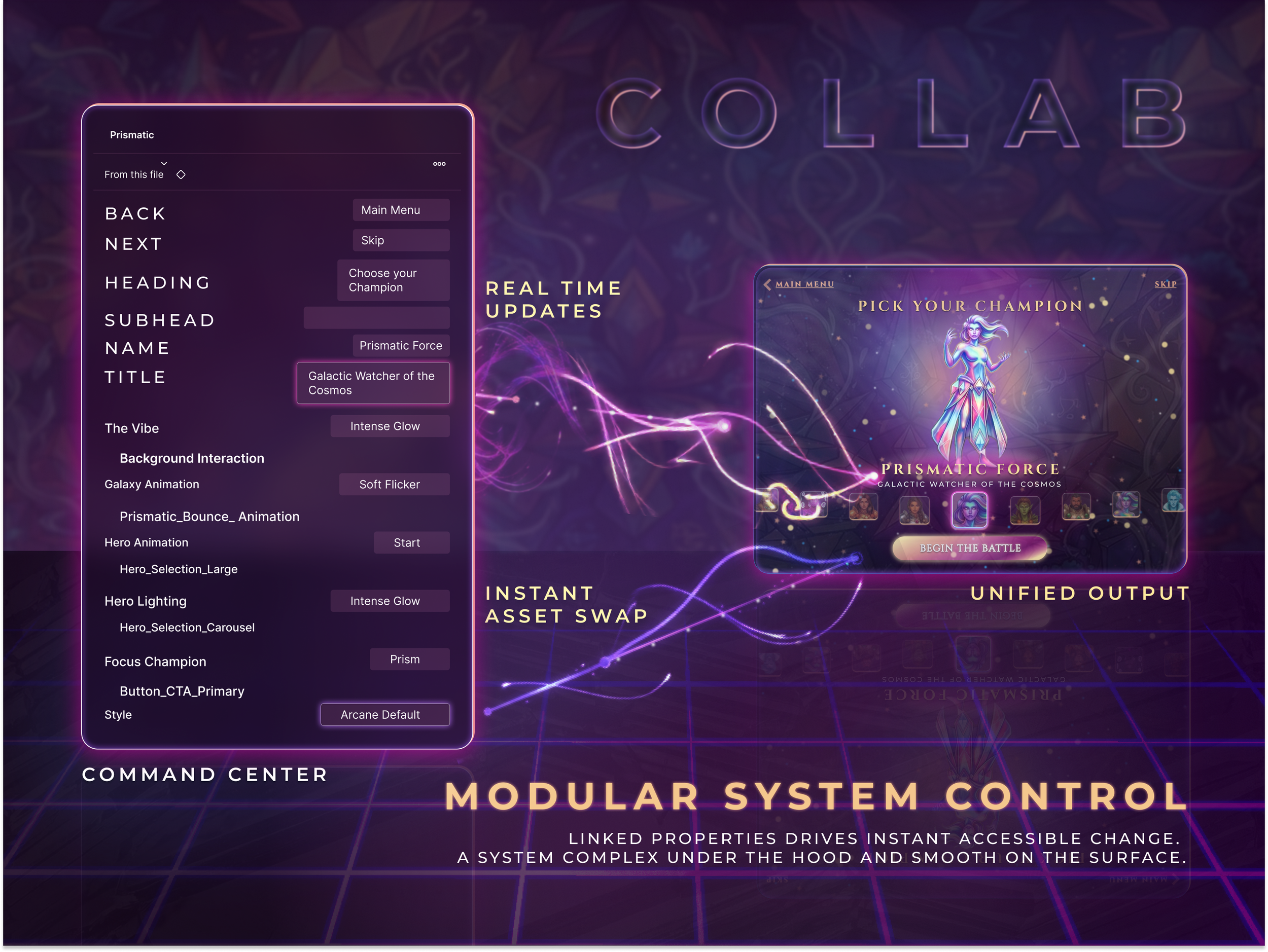 With the architecture in place, adding new characters is a paste-and-rename operation. Motion specs, token export, and additional screen types are all natural extensions of what is already built. Deeper token development opens cross-archetype theming, giving teams the range to produce seasonal content, alternate skins, and new characters without starting from scratch. Complex under the hood, frictionless on the surface, and built so designers, artists, and engineers can all work from the same source of truth.